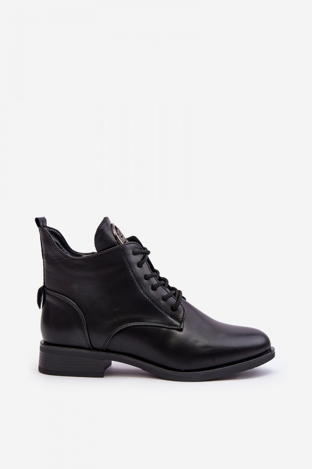 Ankelstøvler til kvinder, fremstillet af øko-læder. Monteret på en flad, stabil hæl. Afrundet tå. Plastdekoration på tungen. Med lynlås i siden og ekstra snørebånd. Isoleret med skotæppe.