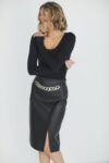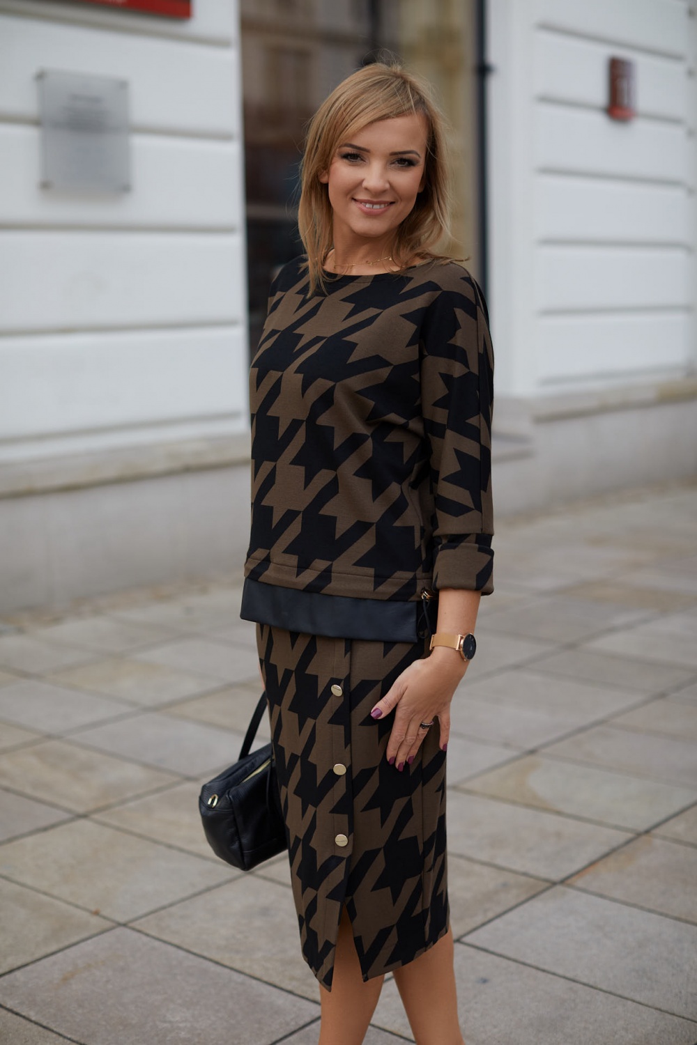 Αυτό το γυναικείο σετ δύο τεμαχίων έχει κλέψει τις καρδιές των πελατών μας. Έχει ραφτεί εξ ολοκλήρου από μαλακό πλεκτό ζακάρ, με το πάνω μέρος να έχει τη μορφή κιμονό, με φαρδύτερο μανίκι που αναδιπλώνεται. Η ελαφρώς εφαρμοστή φούστα με τα χρυσά κουμπιά προσθέτει μια μοντέρνα πινελιά. Με μια φαρδιά ελαστική ζώνη ραμμένη στη μέση, η φούστα επιτρέπει την τέλεια προσαρμογή στη σιλουέτα της ιδιοκτήτριας. Η μπλούζα είναι διακοσμημένη με δερμάτινες κορδέλες. Τα διακοσμητικά μεταλλικά πώματα στο κάτω μέρος της μπλούζας προσθέτουν επίσης στην ελκυστικότητα. Αυτό το καλά μελετημένο κόψιμο παρέχει άνεση για γυναίκες όλων των μεγεθών. Χωρίς φόδρα.