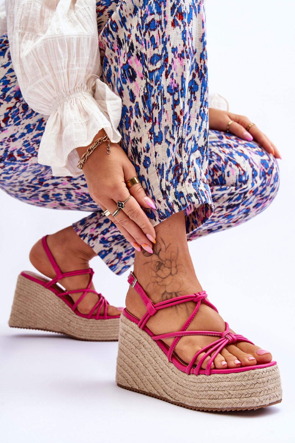 Όμορφα γυναικεία σανδάλια σε πλατφόρμα και άγκυρα. Τα λουράκια είναι κατασκευασμένα από οικολογικό δέρμα και ενώνονται μεταξύ τους. Τα παπούτσια διαθέτουν μαλακό πάτο από οικολογικό δέρμα. Τα σανδάλια στερεώνονται γύρω από τον αστράγαλο με αγκράφα με ρυθμιζόμενο λουράκι. Η πλαστική σόλα έχει αυλακώσεις, ενώ η πλατφόρμα και η εξέδρα έχουν διακοσμηθεί με πλεξούδα γιούτα. Πρόκειται για ένα πολύ ευέλικτο κόψιμο που ταιριάζει με πολλά στυλ.