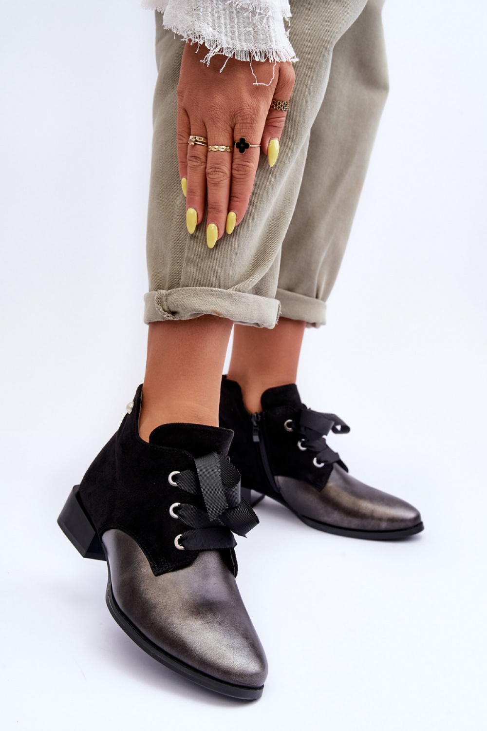 Μοντέρνες γυναικείες ημίψηλες μπότες με μήκος μέχρι τον αστράγαλο, κατασκευασμένες από οικολογικό δέρμα. Αυτό το μοντέλο κλείνει με φερμουάρ στο πλάι και επιπλέον δένονται με κορδόνια. Τοποθετείται σε ένα επίπεδο, σταθερό τακούνι. Ζεσταίνεται εσωτερικά με κουβέρτα παπουτσιών. Ο πάτος της φτέρνας είναι ενισχυμένος.