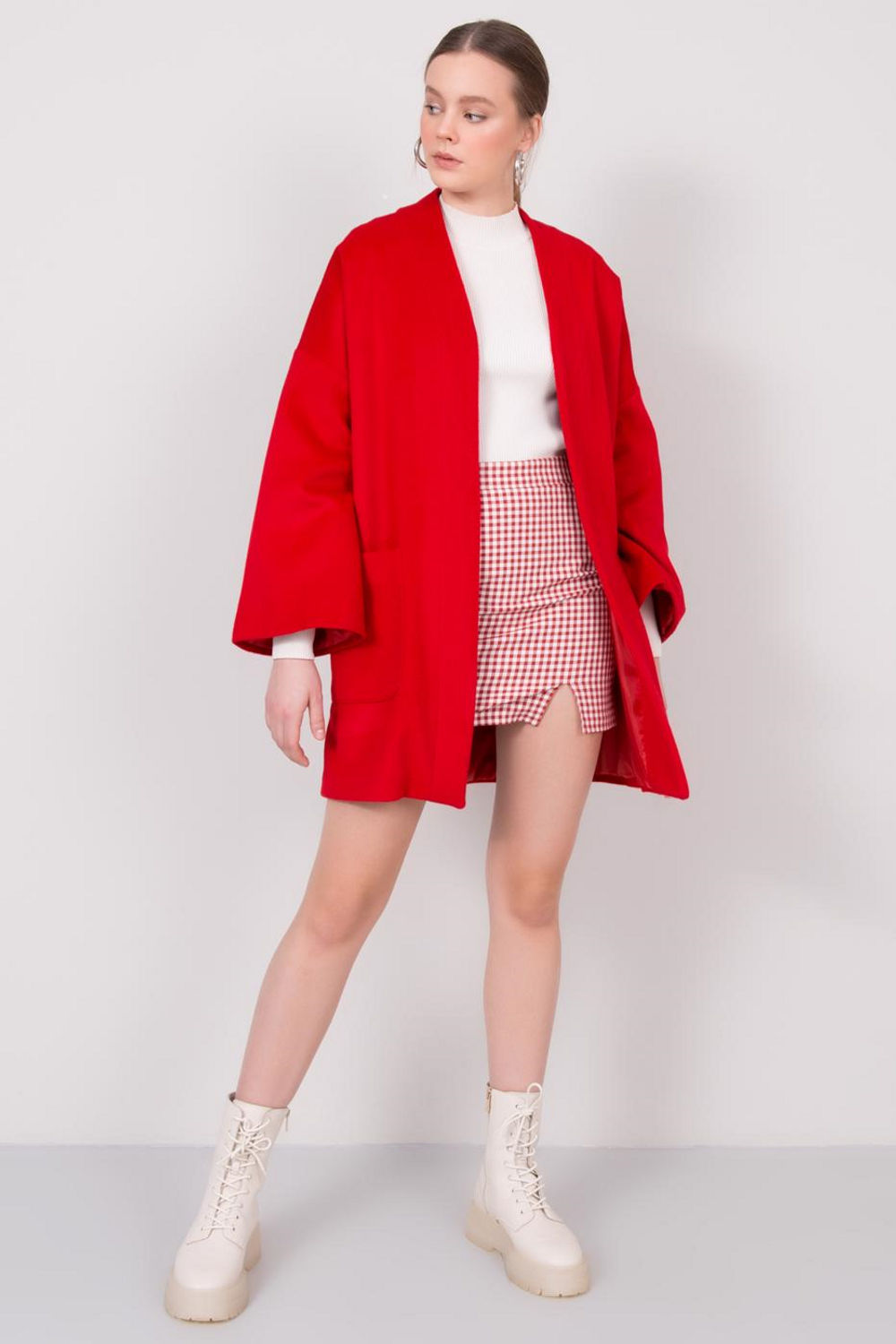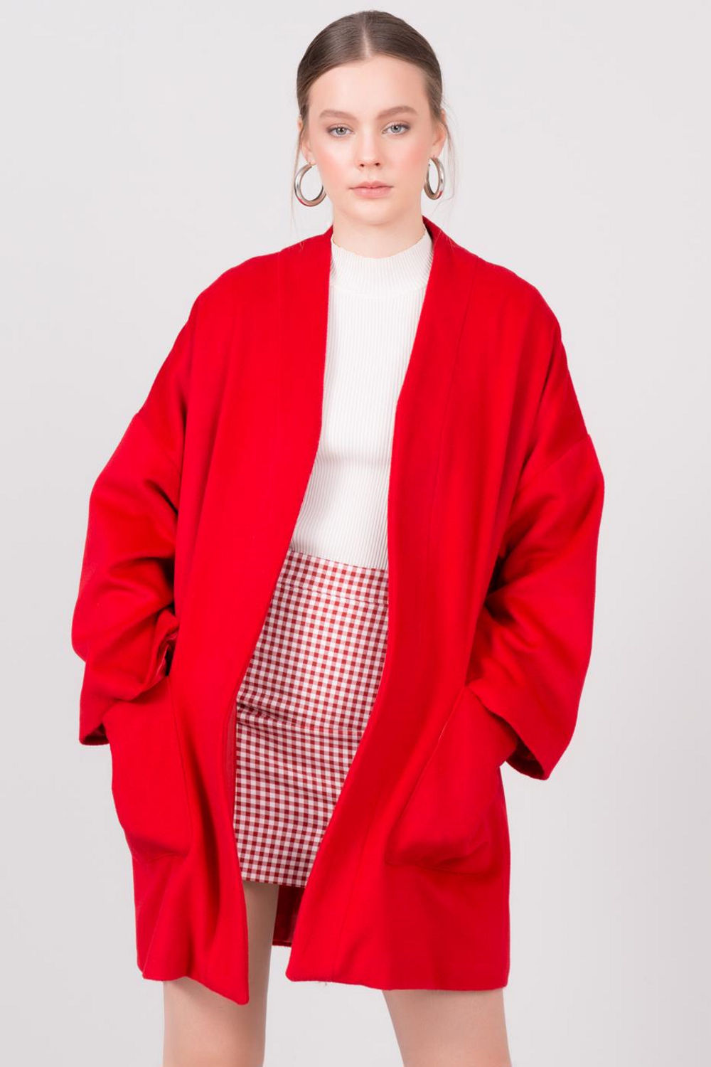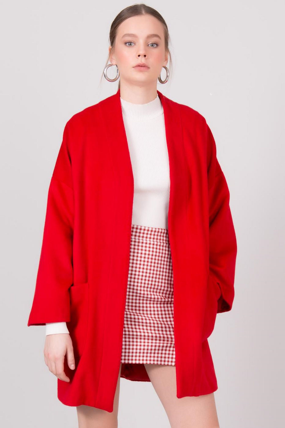 Κόκκινο γυναικείο παλτό χωρίς κουμπιά. Το παλτό διαθέτει τσέπες.