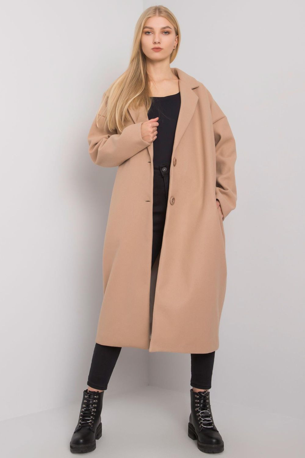 Μπεζ γυναικείο μακρύ παλτό με κλείσιμο με κουμπιά. Το παλτό έχει τσέπες. Το παλτό είναι πλήρως φοδραρισμένο.