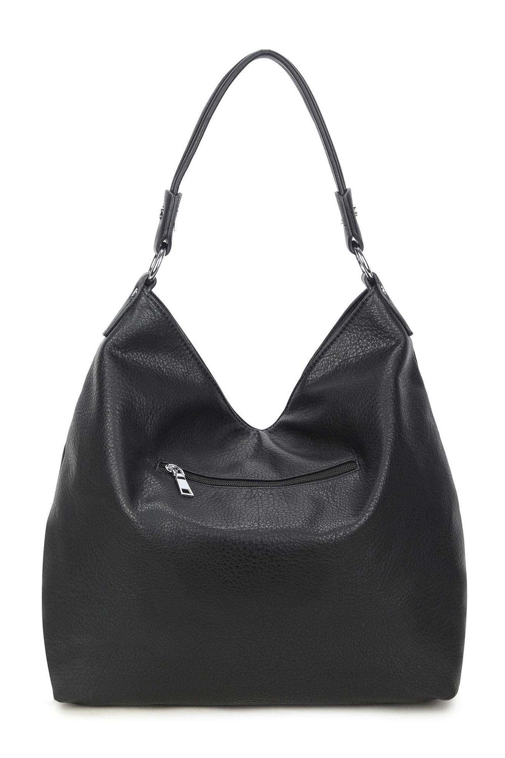 Μαύρη μεγάλη τσάντα πόλης από οικολογικό δέρμα, με φερμουάρ. Εσωτερικά, θήκη με φερμουάρ, τσέπη με φερμουάρ στη μία πλευρά, τσέπη για τηλέφωνο ή μικροαντικείμενα στην άλλη. Δύο τσέπες με φερμουάρ μπροστά, τσέπη με φερμουάρ πίσω.