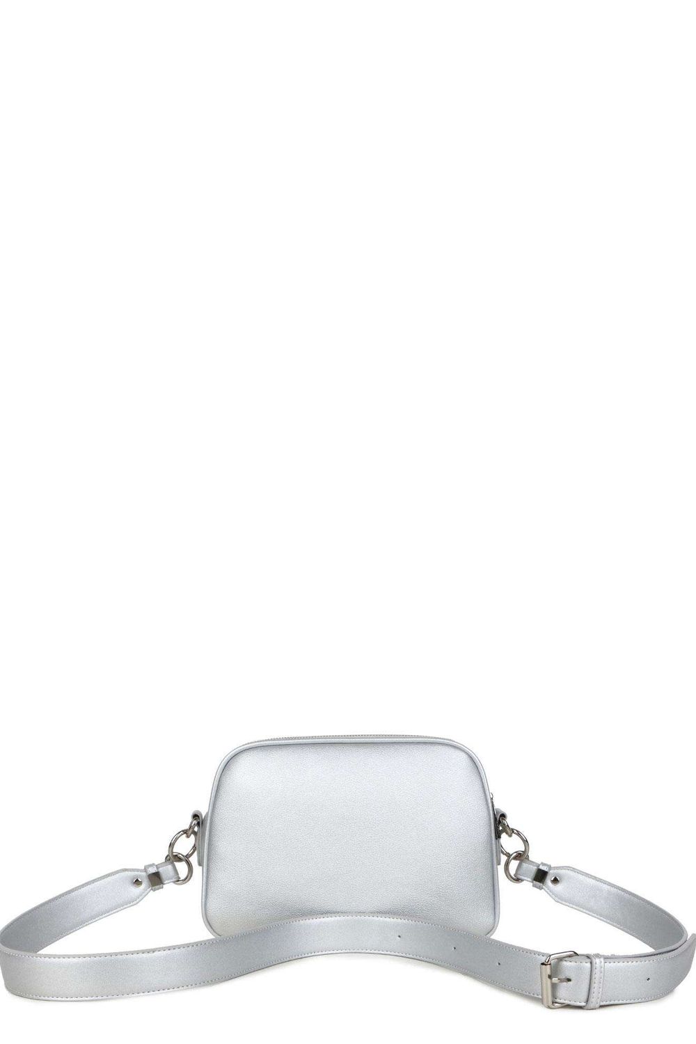 Ασημί τσάντα από οικολογικό δέρμα. Τσάντα με τρεις θήκες, δύο με φερμουάρ και μία με μαγνήτη. Στη μέση του ενός διαμερίσματος μια τσέπη με φερμουάρ, στο άλλο μια τσέπη για το τηλέφωνο ή μικρά αντικείμενα.
